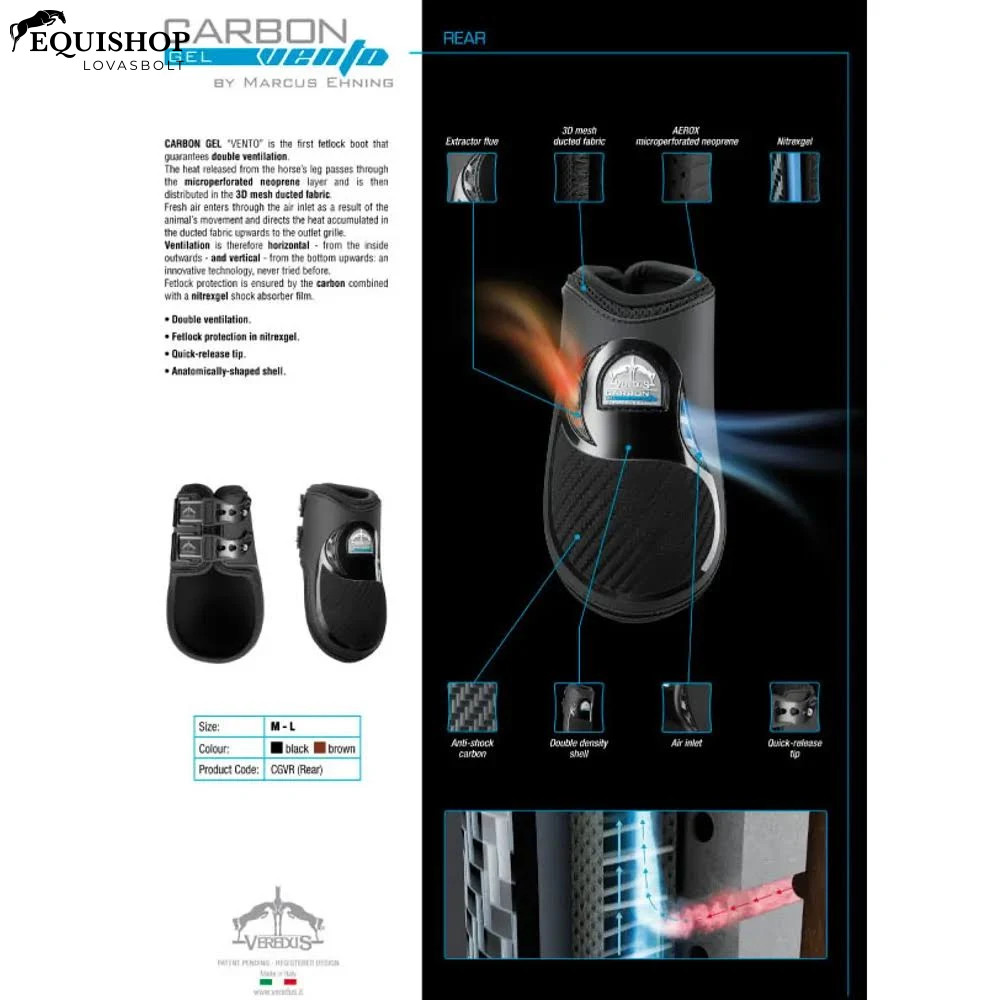 Veredus CARBON GEL VENTO bokavédő - A Carbon Gel Vento az első bokavédő, mely garantálja a dupla szellőzést. A ló lábából áradó hő áthatol a mikroperforált neoprén rétegen, majd eloszlik a 3D hálós, légcsatornázott anyagon. A friss levegő beáramlik a nyílásokon az állat mozgásának köszönhetően, ami így kivezeti a hőt a nyílásokon.
