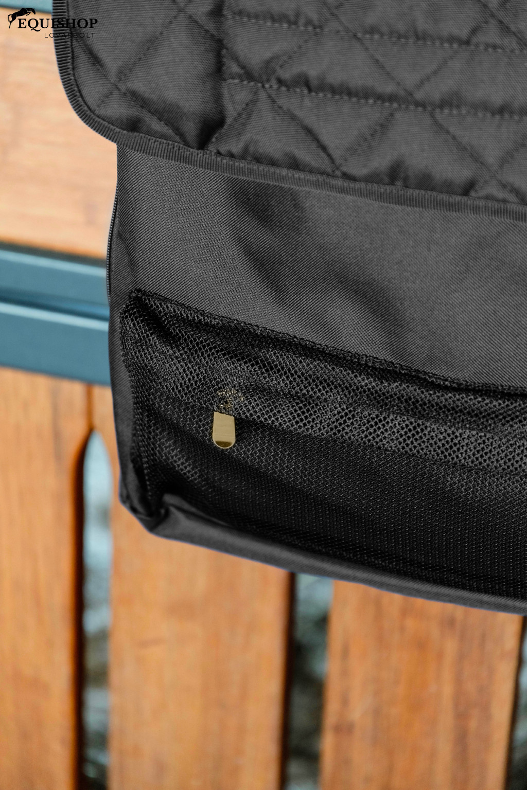A boxtáska külső anyaga 600D poliészter, ami azt jelenti, hogy nagyon erős és tartós. Tökéletes az istállóban való használatra.