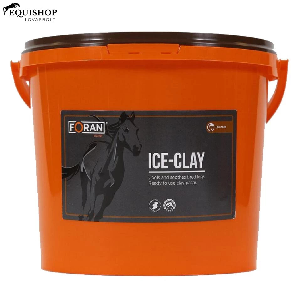Munkában, versenyben, tréningben lévő lovak számára. Felhasználásra kész, jellegzetes teafaolaj illatú hidratáló, hűtő és nyugató hatású agyag borogatás. Munkát, tréninget követően ajánlható alkalmazása, mert a fokozott munkától felmelegedett lábakon keletkezett hőt gyorsan elvezeti és ezáltal az állatok közérzete javul. Az Ice-Clay hideg borogatásként javasolt a traumás eredetű lábsérülések tüneti kezelésére is (ütések, zúzódások, inhüvely gyulladás, meghúzódott inak, inpók, csánk és szárkapocs csont elváltozások), mert segíti a duzzanat, a fájdalom és a gyulladás csökkentését. A benne levő teafaolaj természetes fertőtlenítő hatású.