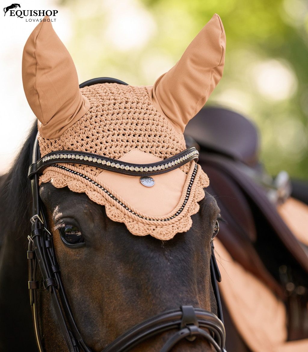 Kiváló minőségű fülvédő, rugalmas fülrésszel, amely tökéletesen illeszkedik a Turin kollekciónkhoz. A két azonos tónusú díszzsinór között futó csillogó strassz szalag elegáns megjelenést biztosít. Az ezüst fém logólemez középen, egy fényes (glossy) anyagú textil applikáción kapott helyet, így harmonikus összhatást teremt a szettel. A Turin fülvédő hatékony védelmet nyújt a zavaró rovarok ellen is. A fülrésznél alkalmazott rugalmas anyag optimális illeszkedést biztosít a ló fején.