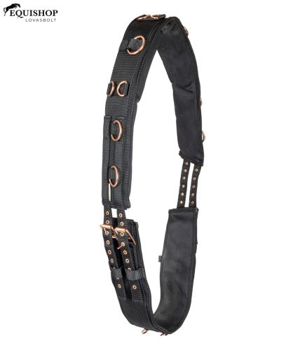 Extra puha futószárazó heveder, amely kivételes kényelmet biztosít a lónak. A heveder könnyen állítható a mindkét oldalon található görgős csatok segítségével. 12 gyűrűvel rendelkezik. Rosegold szerelékekkel díszítve.