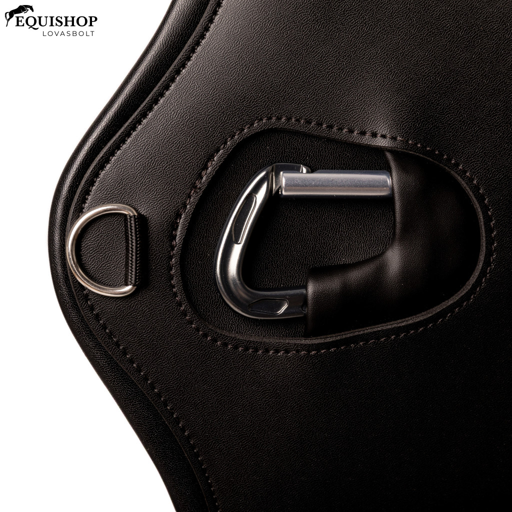 Ennek a hasvédős hevedernek az anatómiai formája aprólékosan lett kidolgozva, hogy a ló kényelmét és teljesítményét helyezze előtérbe. A forma szabaddá teszi a könyököket, csökkentve a korlátozást, és lehetővé téve a természetes, gátlástalan mozgást bármilyen tevékenység során. Az egyenletes nyomáseloszlás, amelyet mindkét végén rugalmas szalagok biztosítanak, minimalizálja a kellemetlenséget és elősegíti a ellazulást, még intenzív munka közben is. Gondosan megtervezett, lapos központi horoggal, zökkenőmentesen illeszkedik a hevederbe, hogy fokozza a biztonságot anélkül, hogy veszélyeztetné a letisztult megjelenést vagy a ló mozgásszabadságát. Az ergonómia és az innováció ezen kombinációja kiemelkedő választássá teszi azoknak a lovasoknak, akik a legjobbat akarják lovuk számára.