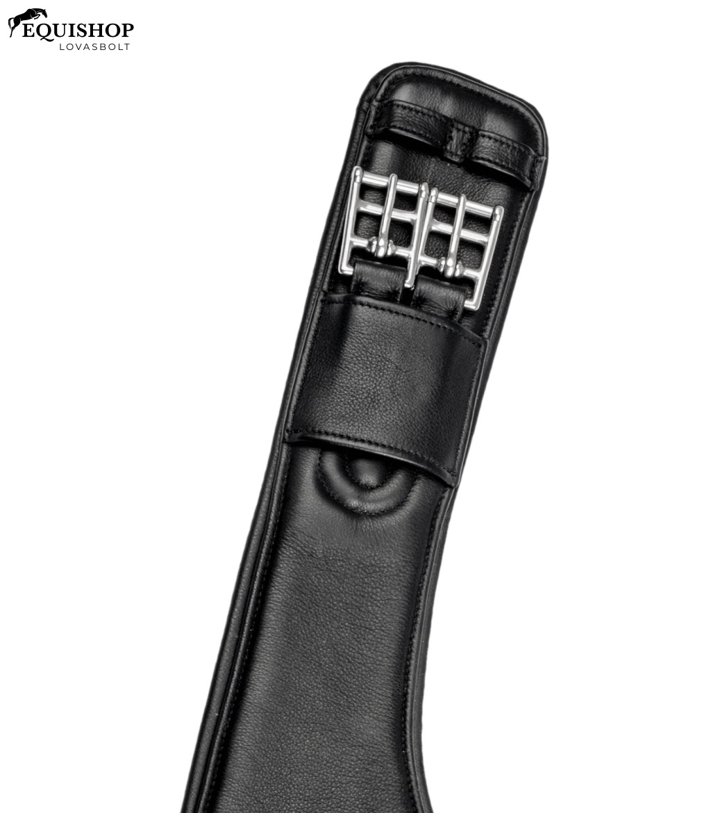Hold alakú heveder a jobb hevederelhelyezéshez lekerekített hátú lovakon, és amikor a nyereg hajlamos előrecsúszni. Kiváló minőségű bőrből készült, nagyon puha párnázással. Rozsdamentes acél D-gyűrűvel és görgős csatokkal. Mindkét oldalon rugalmas.