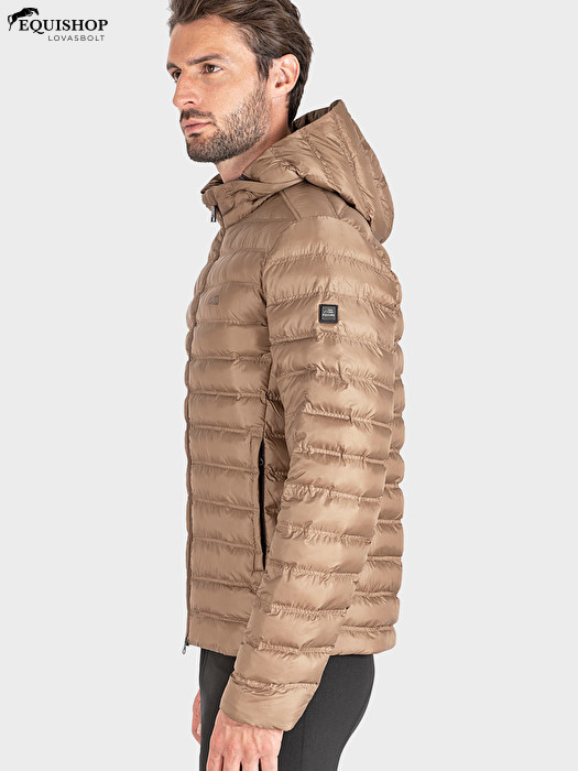 Ez a férfi bomberdzseki szuperkönnyű és kényelmes, teljes hosszúságú középső cipzárral, dupla csúszkás záródással és puha, levehető kapucnival rendelkezik. Kontrasztos béléssel és környezetbarát paplantöltettel rendelkezik.