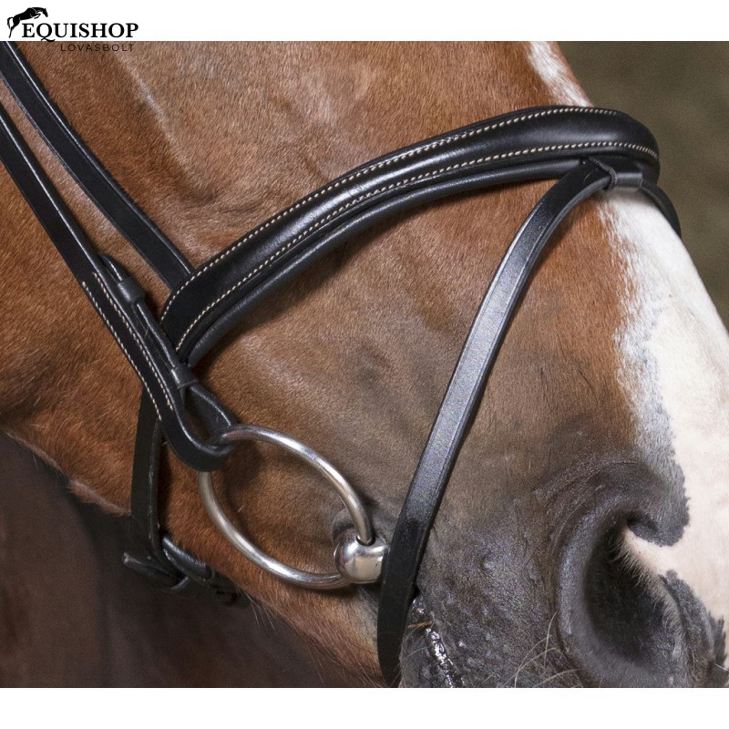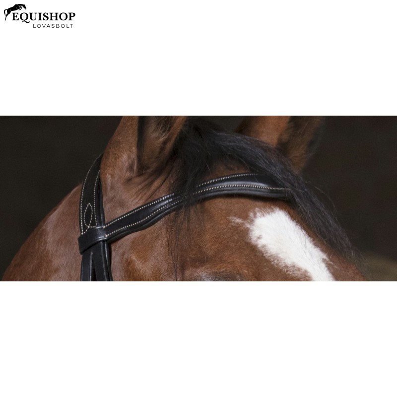 Bivalybőr kantár fejdísszel, tehénbőrrel bélelt homlok- és orrszíjjal, horgokkal a bithevedereken. Fehér varrás. Rozsdamentes acél csatok. Szár nélkül eladó.