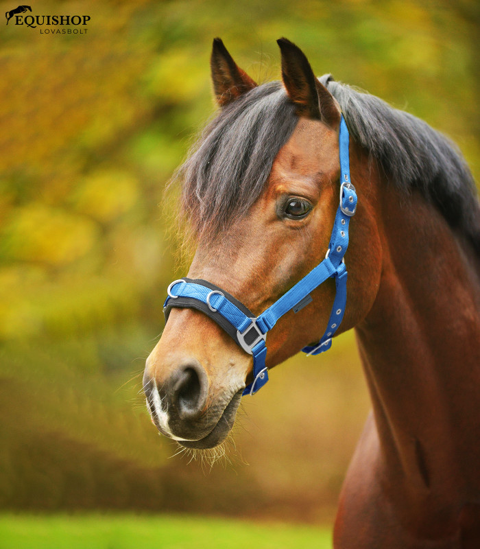Könnyű, tartós, nejlon hevederből készült futószár-kötőfék. Jól párnázott az érzékeny orrnyeregnél.