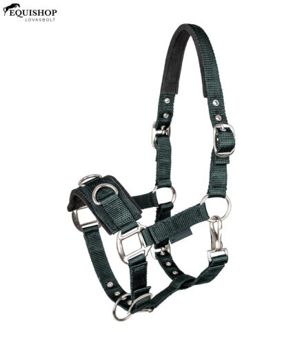 Könnyű, tartós, nejlon hevederből készült futószár-kötőfék. Jól párnázott az érzékeny orrnyeregnél.