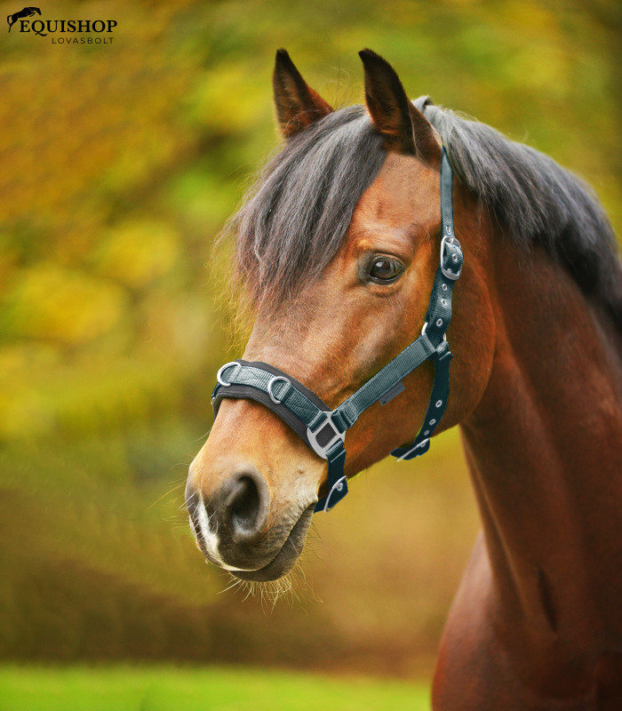 Könnyű, tartós, nejlon hevederből készült futószár-kötőfék. Jól párnázott az érzékeny orrnyeregnél.