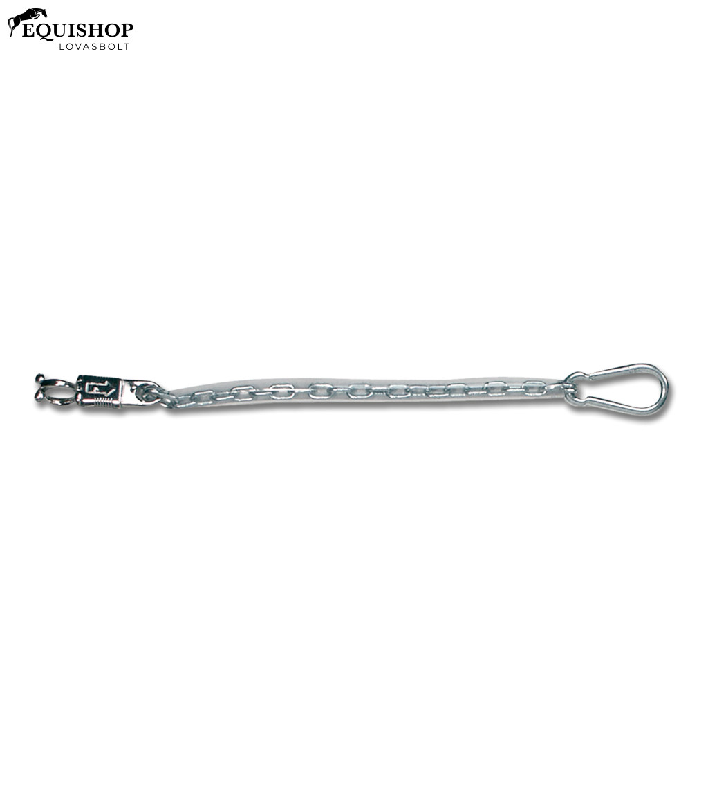 Átlátszó, bevonatos lánc pánikhoroggal és karabinerrel.