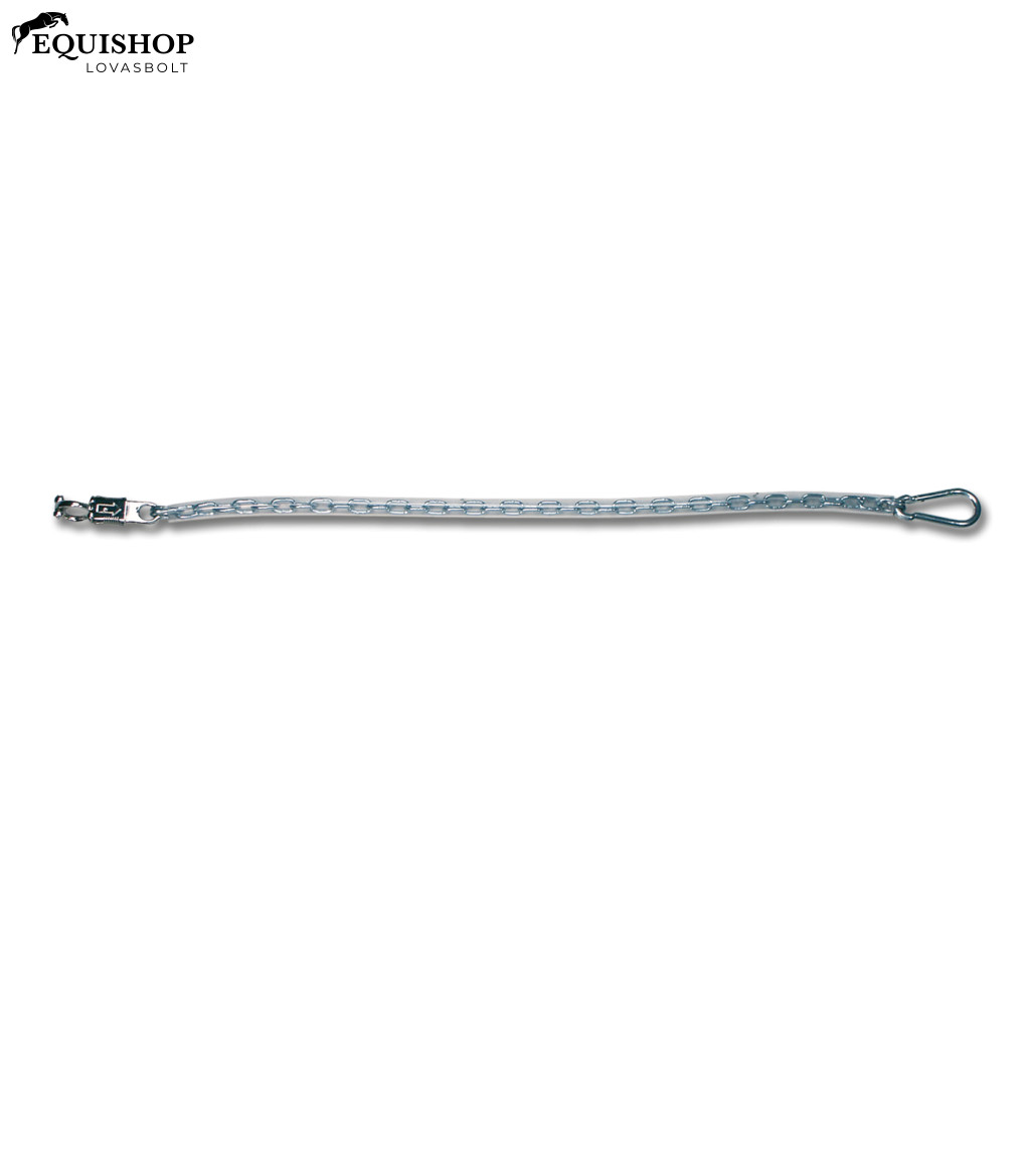 Átlátszó, bevonatos lánc pánikhoroggal és karabinerrel.