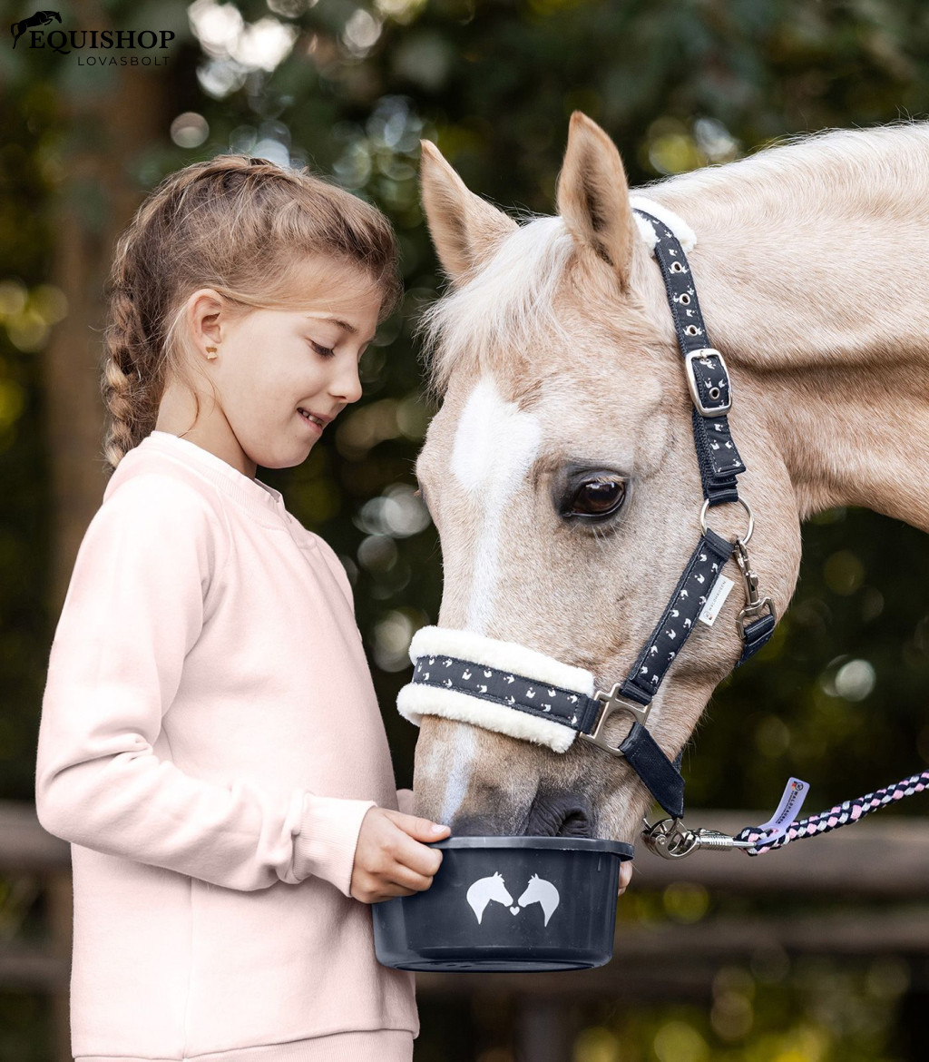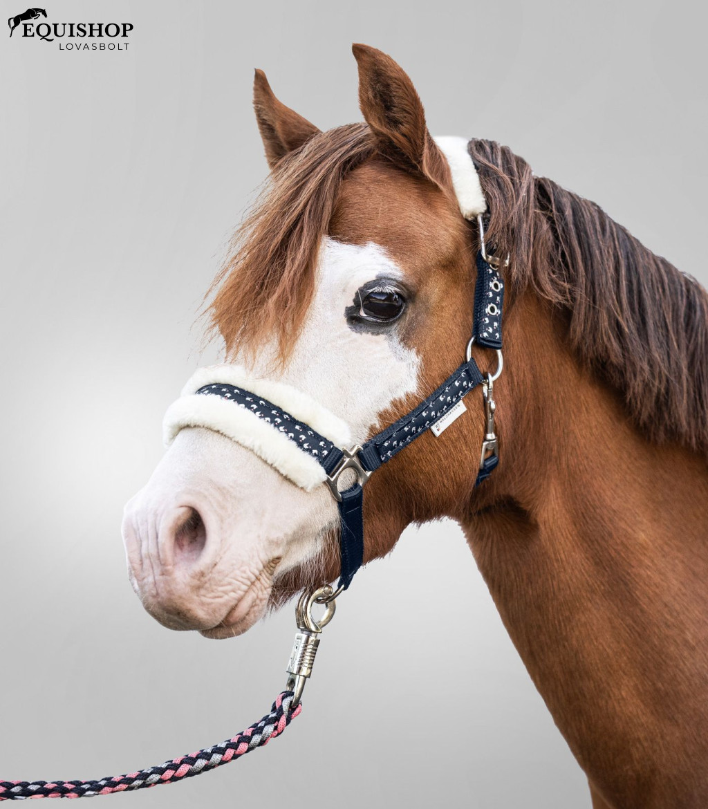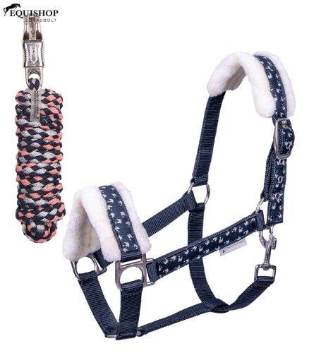 Bájos kötőfék aranyos mintával és hozzáillő háromszínű vezetőszárral. A kötőfék puha műszőrmével párnázott az orrszíjnál és a faroknál a kényelmes viselet érdekében. Mindkét oldalon csatokkal állítható, így különösen jó illeszkedést és kényelmes viseletet biztosít a ló számára.