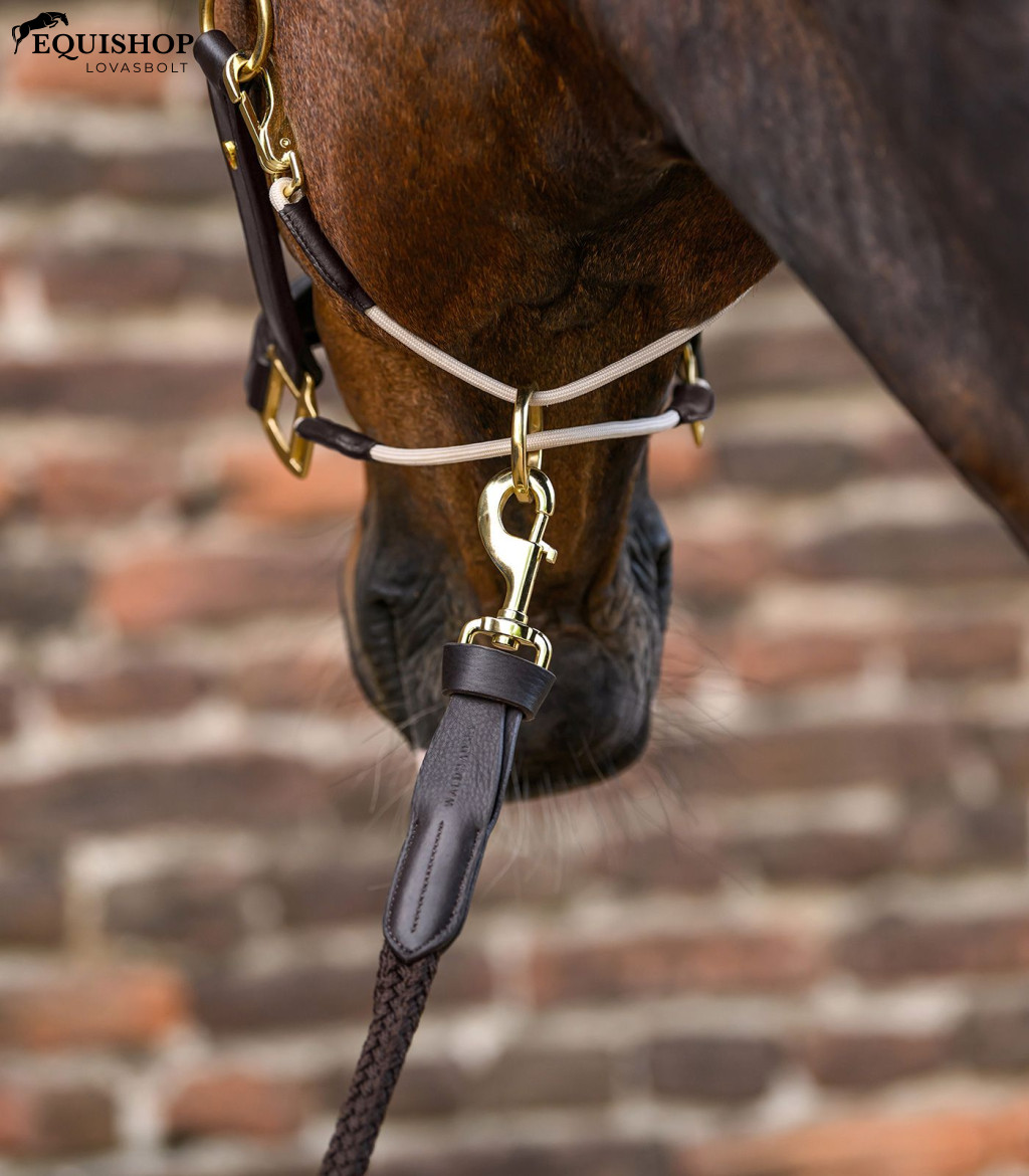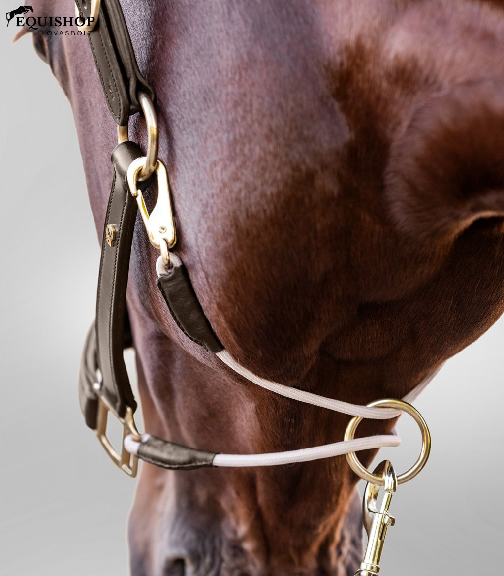 Minőségi bőr kötőfék anatómiailag formázott fejdísszel, mindkét oldalon állítható. Az orrpánt és a fejrész lágyan párnázott. A torokpánt és az orrszíj hátsó része finom kötélből készült. Mindkét részt egy forgógyűrű köti össze, aminek köszönhetően szilárdan ül és nem csúszik. Ezenkívül elkerülhető a „kötélbe lépés” veszélye.