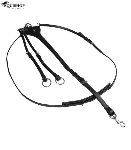Levehető és hosszában állítható martingálvilla. Karabiner segítségével egyszerűen rögzíthető a hevederhez. Rozsdamentes acél csatokkal.