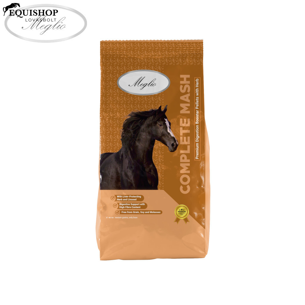 A Meglio Complete Mash egy gabonamentes (gabonaszemeket nem, csak korpát tartalmaz), alacsony keményítő- és cukortartalmú takarmány, amely kifejezetten ajánlott kólikára hajlamos, gyomorfekélyes, anyagcserezavarokkal küzdő, betegségből lábadozó vagy étvágytalan lovak számára. Könnyen emészthető, magas rosttartalmú összetétele lenmaggal kiegészülve segít fenntartani az egészséges bélműködést, csökkentheti az emésztési problémák kockázatát és támogatja a szervezet regenerálódását. Hosszú időt boxban töltő lovak számára is ideális választás a kólika elkerülése, és a bélflóra támogatása érdekében. Gabona*-, melasz- és szójamentes, a FEI szabályzatának megfelelően doppingnak minősülő összetevőt nem tartalmaz. Zabmentes, gyógynövényes lótáp a maximális egészségmegőrzésért!