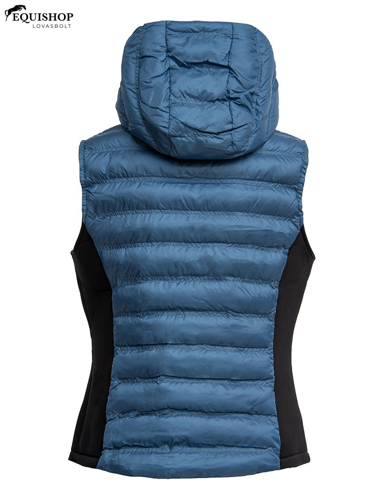 Equiline kék női mellény, szuper könnyű és kényelmes. Jellemzői: kontrasztos színű bélés, rugalmas neoprén anyag a csípőnél, steppelt ökológiai paplantöltet és teljes értékű középső cipzár dupla cipzárral. Úgy tervezték, hogy kiemelje a női alakot.