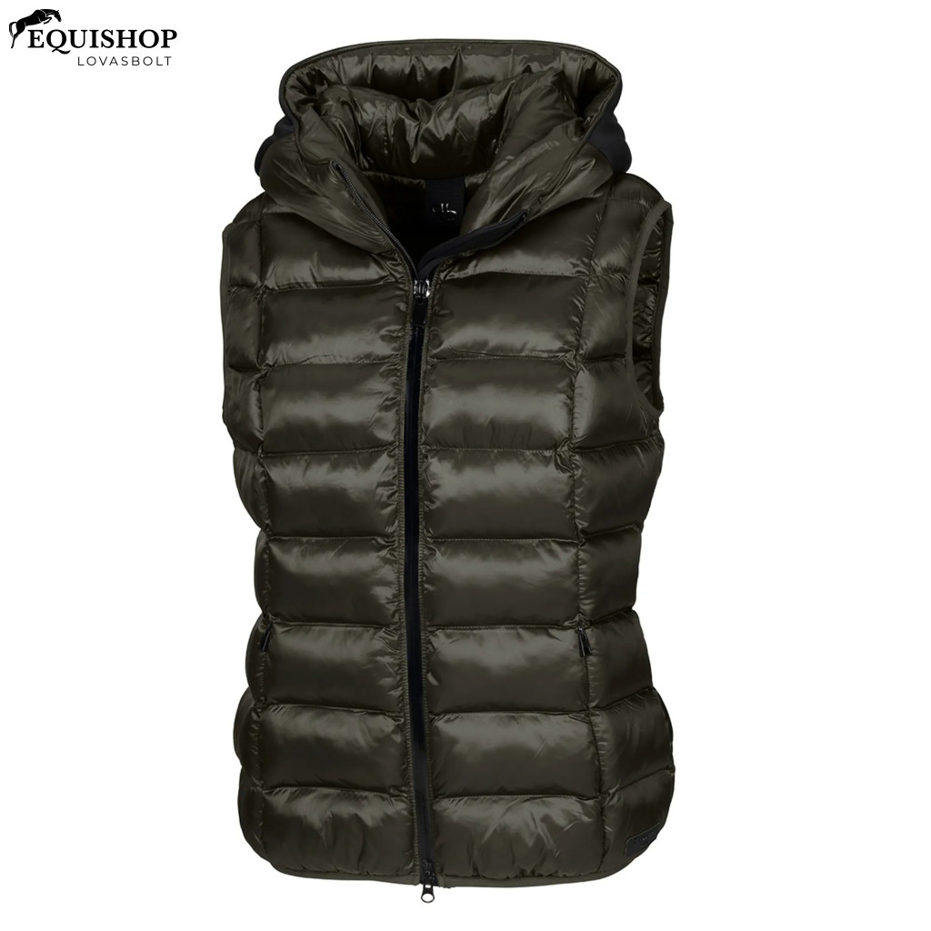 A SIA női steppelt mellény egy stílusos, praktikus és funkcionális ruhadarab, amely az idei szezonban is az Ön kedvenc darabja lesz. A kiváló minőségű, csillogó nylon anyagnak köszönhetően rendkívül könnyű és kényelmes viselet. A szálas golyós vatta segít a hőt a ruhadarab belsejébe zárni, és melegen tartja Önt, amikor a hőmérséklet csökken. A csatolt kapucni maximális fedést és védelmet nyújt az elemektől. A kapucni betétjén található PIKEUR lakknyomatok elegáns befejezést adnak a ruhadarabnak.