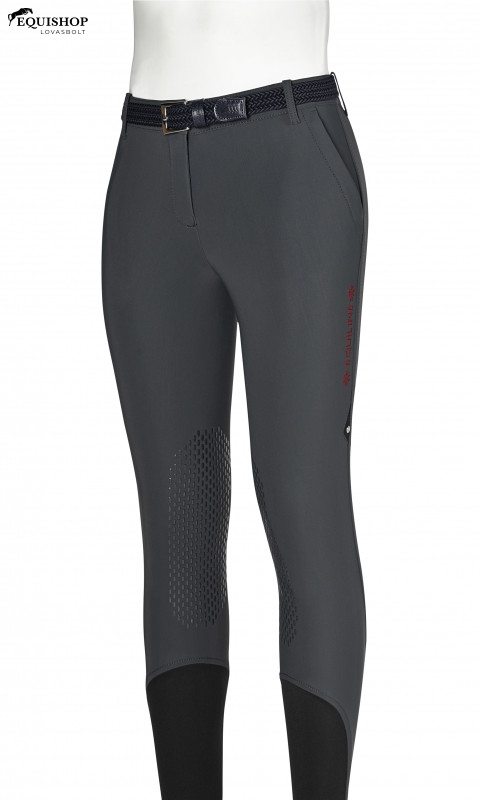 Equiline Vixen női lovaglónadrágjai térdszilikonnal rendelkeznek. Ünnepi megjelenésükkel és funkcionális tulajdonságaikkal lenyűgözőek. Lélegzőek, szennyeződéstaszítóak és gyorsan száradnak. A 4 irányban rugalmas anyagnak és a rugalmas lábszárrészeknek köszönhetően nagyon kényelmesek. A bal combon az Equiline logó látható két hópelyhes díszítéssel.