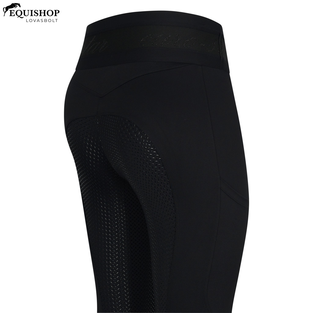 A magas derekú kialakítás, hihetetlenül kényelmes és puha, támasztó derékpánttal, fémes fonallal díszített, márkás rugalmas szalaggal díszítve, kifinomult eleganciát kölcsönözve. Imádni fogja a folyékony formájú vonalakat, amelyek előnyös, nőies sziluettet alkotnak, amelyet a bal száron csillogó strassz eurocsillag logó egészít ki. A mindkét oldalon található praktikus telefonzsebekkel és a stratégiailag elhelyezett teljes értékű markolattal a kivételes nyeregbiztonság érdekében a szükséges holmid mindig kéznél van, így kizárólag a lovaglásra koncentrálhatsz.