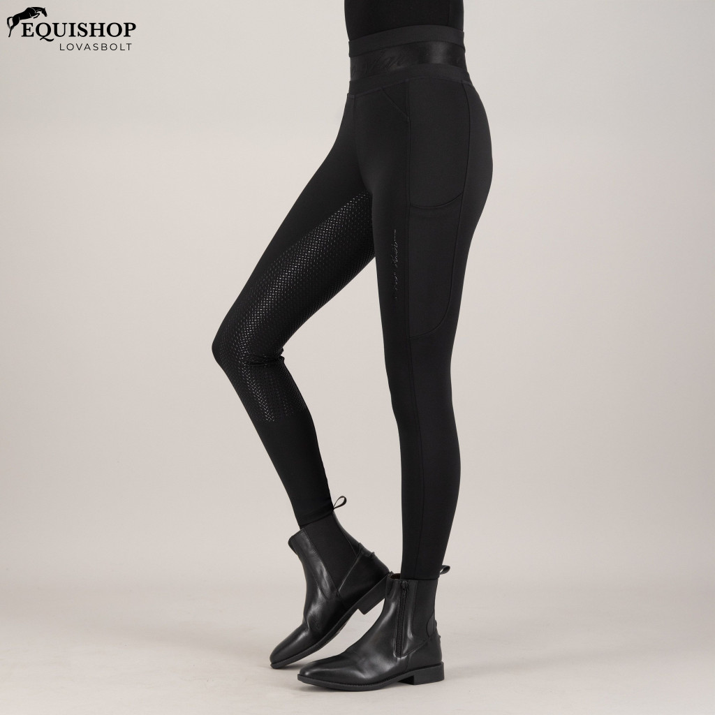 A magas derekú kialakítás, hihetetlenül kényelmes és puha, támasztó derékpánttal, fémes fonallal díszített, márkás rugalmas szalaggal díszítve, kifinomult eleganciát kölcsönözve. Imádni fogja a folyékony formájú vonalakat, amelyek előnyös, nőies sziluettet alkotnak, amelyet a bal száron csillogó strassz eurocsillag logó egészít ki. A mindkét oldalon található praktikus telefonzsebekkel és a stratégiailag elhelyezett teljes értékű markolattal a kivételes nyeregbiztonság érdekében a szükséges holmid mindig kéznél van, így kizárólag a lovaglásra koncentrálhatsz.