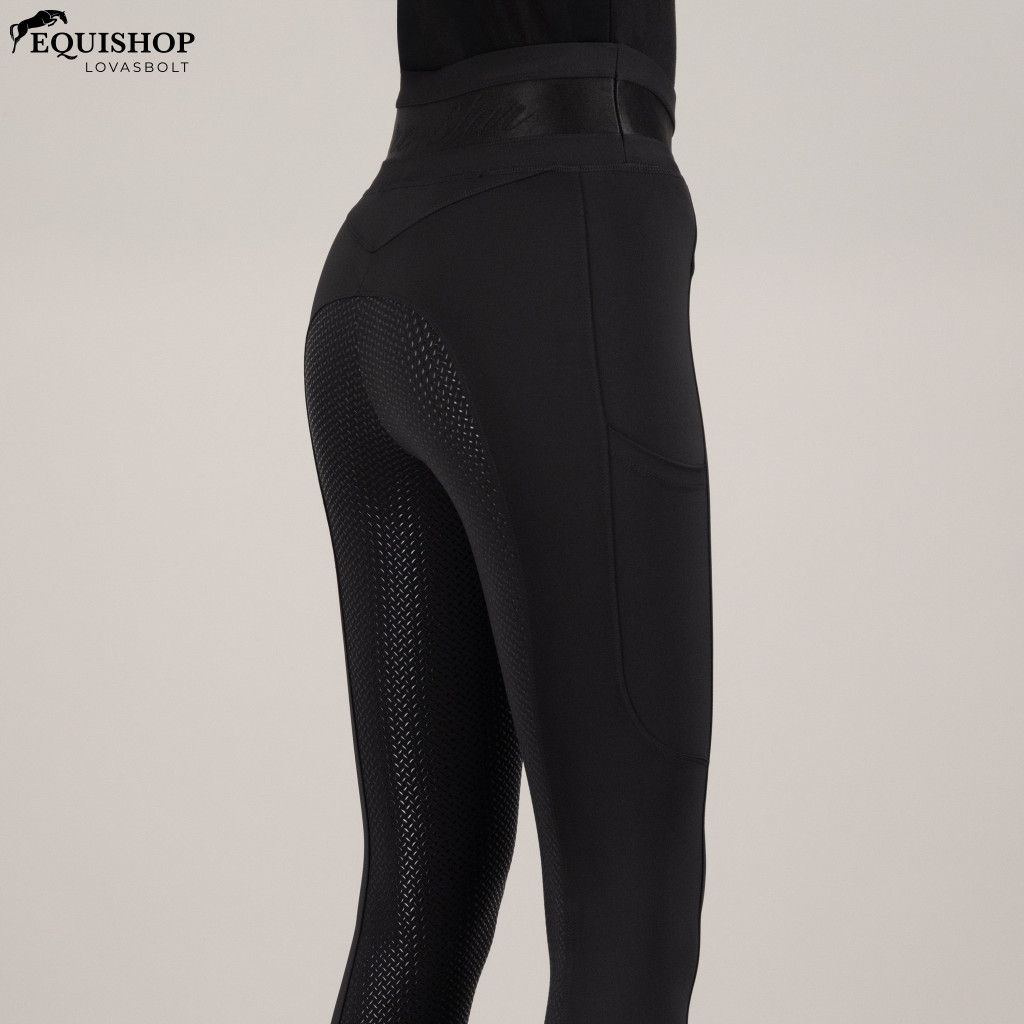A magas derekú kialakítás, hihetetlenül kényelmes és puha, támasztó derékpánttal, fémes fonallal díszített, márkás rugalmas szalaggal díszítve, kifinomult eleganciát kölcsönözve. Imádni fogja a folyékony formájú vonalakat, amelyek előnyös, nőies sziluettet alkotnak, amelyet a bal száron csillogó strassz eurocsillag logó egészít ki. A mindkét oldalon található praktikus telefonzsebekkel és a stratégiailag elhelyezett teljes értékű markolattal a kivételes nyeregbiztonság érdekében a szükséges holmid mindig kéznél van, így kizárólag a lovaglásra koncentrálhatsz.