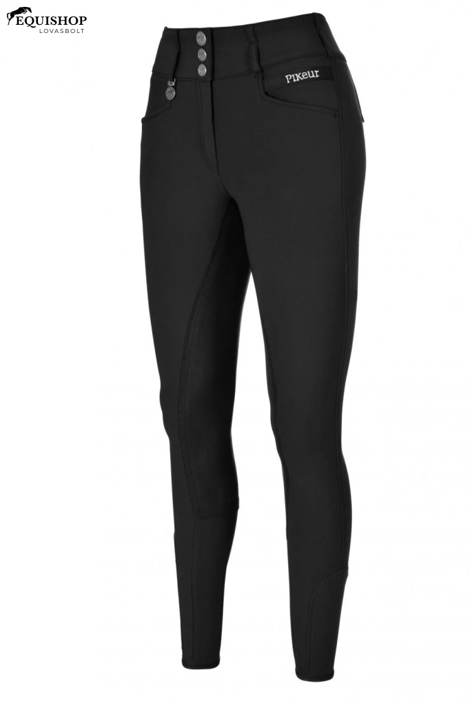 A kiváló minőségű, négyirányú elasztikus anyagból készült női lovaglónadrág, mely nagyon kényelmes a bőrnek és légáteresztő is egyben. Magas derekú, ennek köszönhetően nagyon szépen kiemeli az alakot, a derékrészben pedig széles övbujtatók kerültek fel. A lábak végén elasztikus betétrész található a jobb illeszkedés érdekében, a felső részen pedig két zsebbel van ellátva. A McCrown teljes bőr ülep jó tapadást biztosít a nyeregben, illetve védi a térdeket a kidörzsölésektől lovaglás közben. Az övbujtatókra egy kis Pikeur logóval ellátott plakett került, a bal zseb fölé pedig szintén a márka logójával ellátott applikáció található.