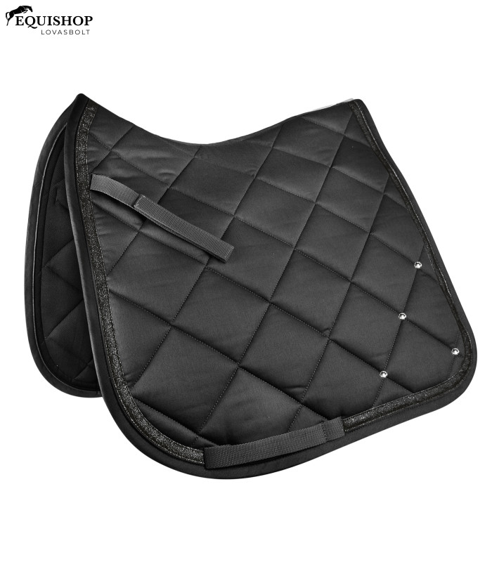 Elegáns, kiváló minőségű nyeregalátét csillámos szegéllyel. A hozzáadott strasszok igazi tekintetet gyönyörködtetővé teszik ezt a nyeregalátét. A funkcionális alsó rész optimális légáteresztő képességet biztosít. A 8 mm-es habszivacs és a 250 g/m²-es vatelin kiváló nyomáseloszlást garantál.