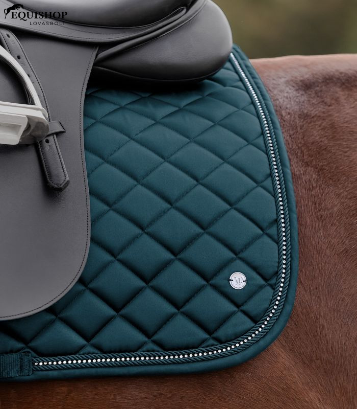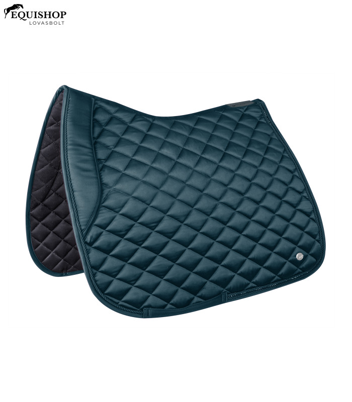 Elegáns, kiváló minőségű nyeregalátét fényes anyagból. Különleges részlet a csillogó strassz sáv két díszzsinór között. A logót egy ezüst fém plakett ábrázolja.
