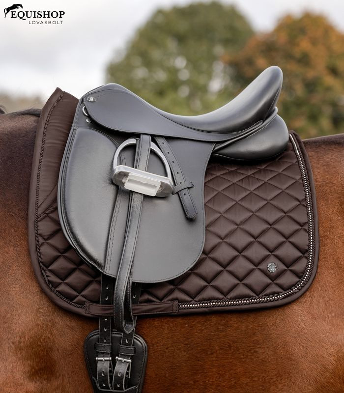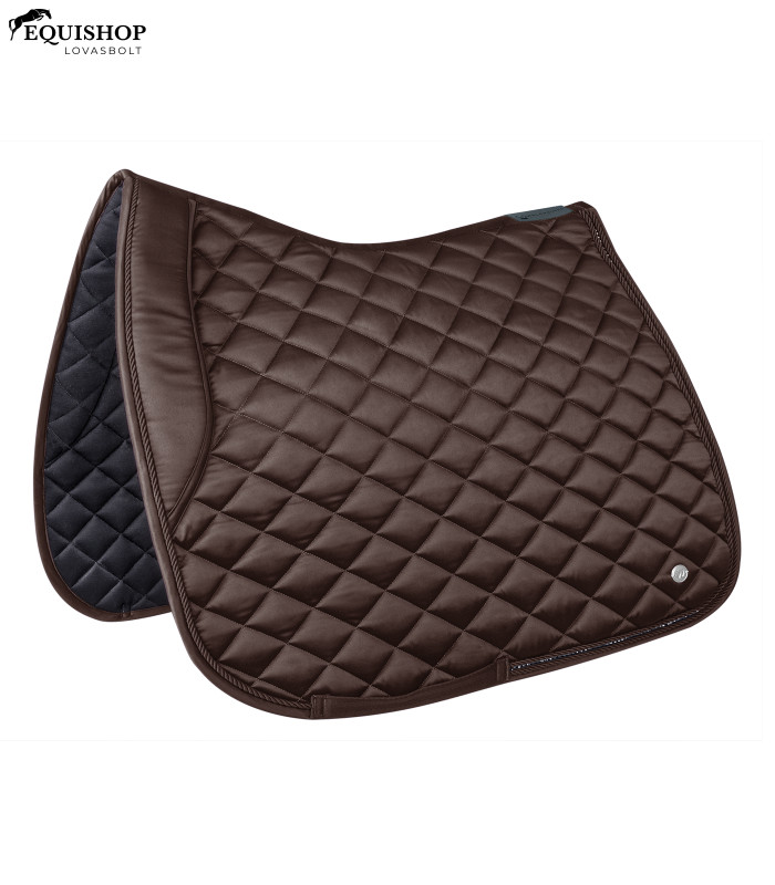Elegáns, kiváló minőségű nyeregalátét fényes anyagból. Különleges részlet a csillogó strassz sáv két díszzsinór között. A logót egy ezüst fém plakett ábrázolja.