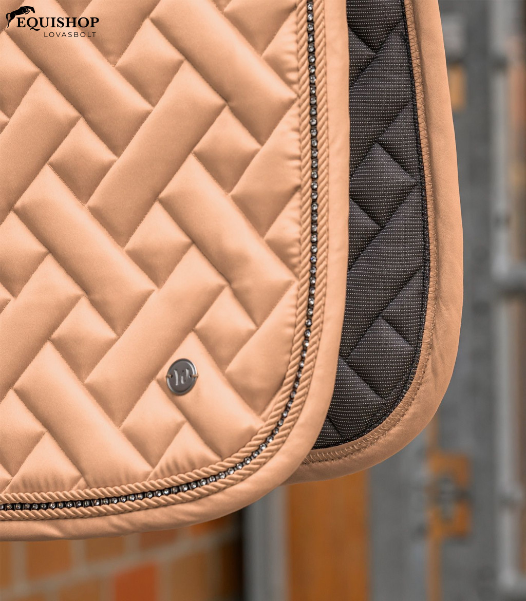 Ez az elegáns nyeregalátét kiváló minőségű, fényes (glossy) anyagból készült, belső oldala hűsítő hatású bambusz és poliészter fonalból készült mesh béléssel biztosítja az optimális nedvességszabályozást. A légáteresztő bambusz bélés antibakteriális és különösen bőrbarát. A két díszzsinór között futó csillogó strassz szalag, valamint az ezüst fém logólemez teszi teljessé a megjelenést. A három rögzítési ponttal ellátott hevederhurok biztos tartást garantál.
