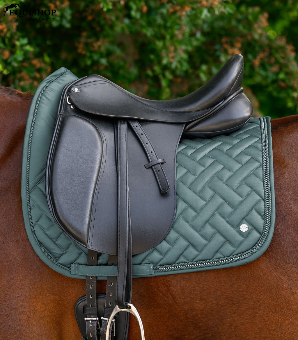 Ez az elegáns nyeregalátét kiváló minőségű, fényes (glossy) anyagból készült, belső oldala hűsítő hatású bambusz és poliészter fonalból készült mesh béléssel biztosítja az optimális nedvességszabályozást. A légáteresztő bambusz bélés antibakteriális és különösen bőrbarát. A két díszzsinór között futó csillogó strassz szalag, valamint az ezüst fém logólemez teszi teljessé a megjelenést. A három rögzítési ponttal ellátott hevederhurok biztos tartást garantál.