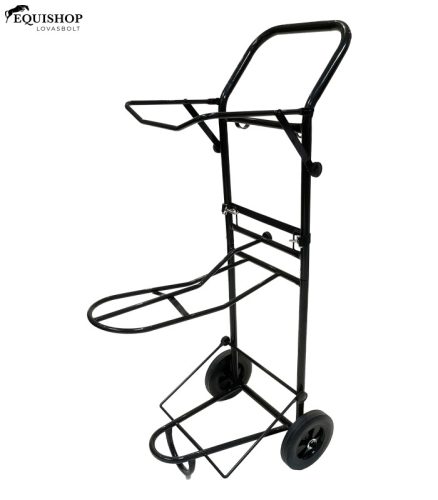 Stabil kocsi nyeregtartóval, 2 horoggal kantár vagy kötőfék számára és egy zárható eszközzel, hogy megakadályozza a kantár földön való vonszolását. Tartozékok tárolórekesze - alkalmas a 15423 Waldhausen Multibag ECO, 40 literes táskához és nagyméretű ápolódoboz tartó - alkalmas a 15410 ápolódobozhoz.