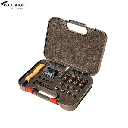 16 sarokcsavarral: 8 hegyes és 8 tompa. Menettisztítóval, sarokcsavarkulccsal, furattisztítóval, gumi és fém sapkákkal.