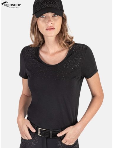 Rövid ujjú póló, sportos női modell, mellkasán Equiline logóval. Elülső panel, általános mikrocsapokkal.