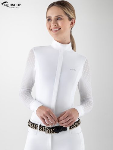 A rugalmas és légáteresztő mez lycrából készült póló páratlan kényelmet és rugalmasságot biztosít a versenyek során. A fehér allover stretch tüll az ujjakon nem csak egy csipetnyi kifinomultságot ad, hanem javítja a légáteresztő képességet is. A zökkenőmentes befejezés érdekében rejtett pattintógombokkal és gyorsan száradó technológiával felszerelt póló szárazon, koncentráltan és a verseny csúcsán tart.