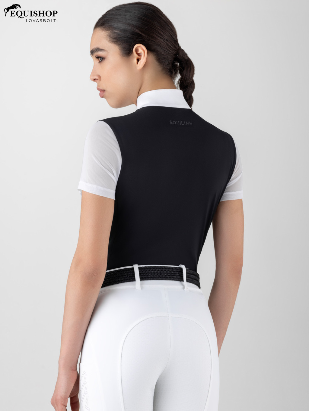 A rugalmas és légáteresztő jersey lycra anyagból készült póló optimális kényelmet és rugalmasságot biztosít a nyeregben. A mellkason és az ujjakon fehér sztreccs tüll részlettel díszítve kifinomultságot és stílust áraszt. A lapos mikrocsapos "EQUILINE" díszítés a hátulján és a gallér logója eleganciát és könnyedséget kölcsönöz. A gyorsan száradó technológiával ez a póló szárazon tart, és a teljesítményére összpontosít, így tökéletes választás a versenylovasok számára.