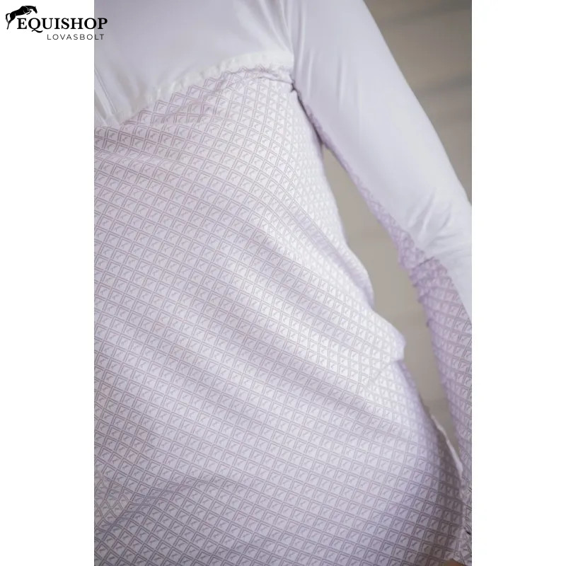 A Debbie Hosszú ujjú Show Polo Shirt egyenes fehér vállpántos, lapos fehér szegéllyel, míg a póló többi része gyönyörű rózsaszín Pénélope mintát mutat. Elegáns mandarin gallérral rendelkezik, amely láthatatlan cipzárral záródik. Kényelmes viselet, könnyű és légáteresztő anyagból készült. Elegáns, de sportos kialakításával ez a póló tökéletes lovasversenyekhez.