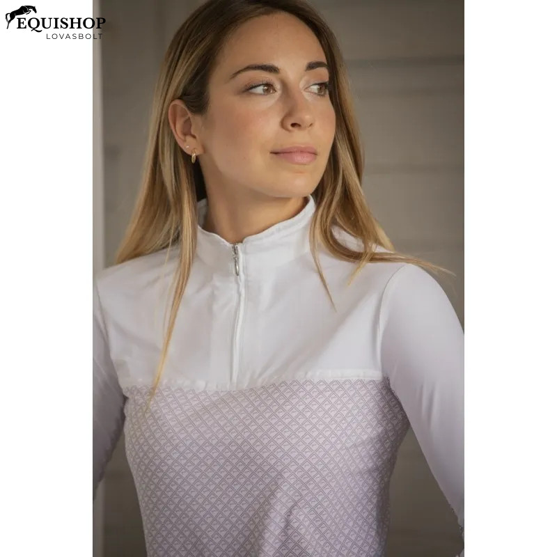 A Debbie Hosszú ujjú Show Polo Shirt egyenes fehér vállpántos, lapos fehér szegéllyel, míg a póló többi része gyönyörű rózsaszín Pénélope mintát mutat. Elegáns mandarin gallérral rendelkezik, amely láthatatlan cipzárral záródik. Kényelmes viselet, könnyű és légáteresztő anyagból készült. Elegáns, de sportos kialakításával ez a póló tökéletes lovasversenyekhez.
