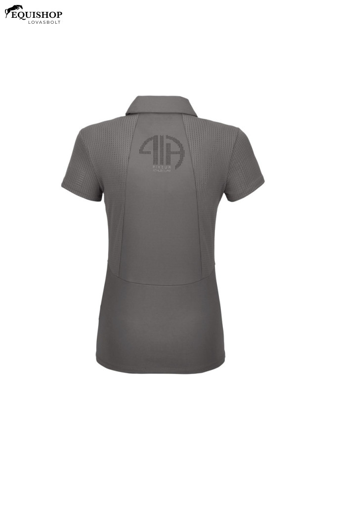 Cipzáros póló légáteresztő funkcionális szövetből. Oldalrészek és ujjak perforált szövetből. Perforált PA (Pikeur Athleisure) felirat a hátoldalon. Fényes cipzáras anyag 75% POLIÉSZTER, 25% ELASTÁN