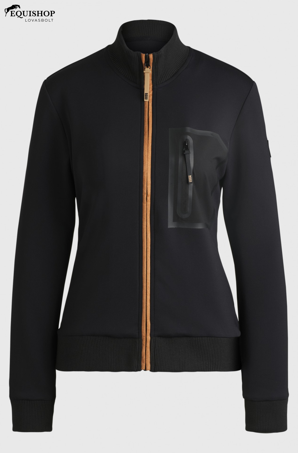 Sportos, 2. rétegű kabát elöl cipzárral, állógallérral és bordás dzsörzéből készült mandzsettával. Foltos, ragasztott mellzseb cipzárral.- 85% POLIAMID / 15% ELASZTÁN