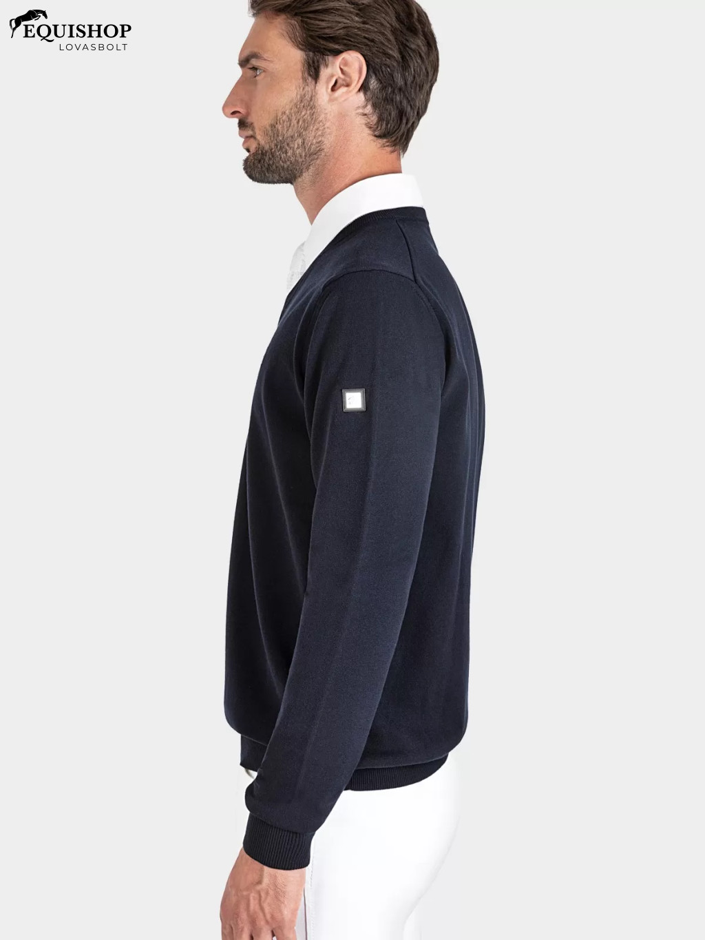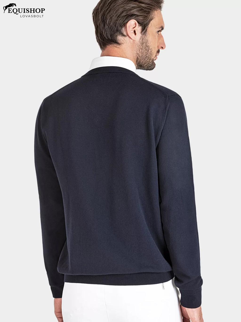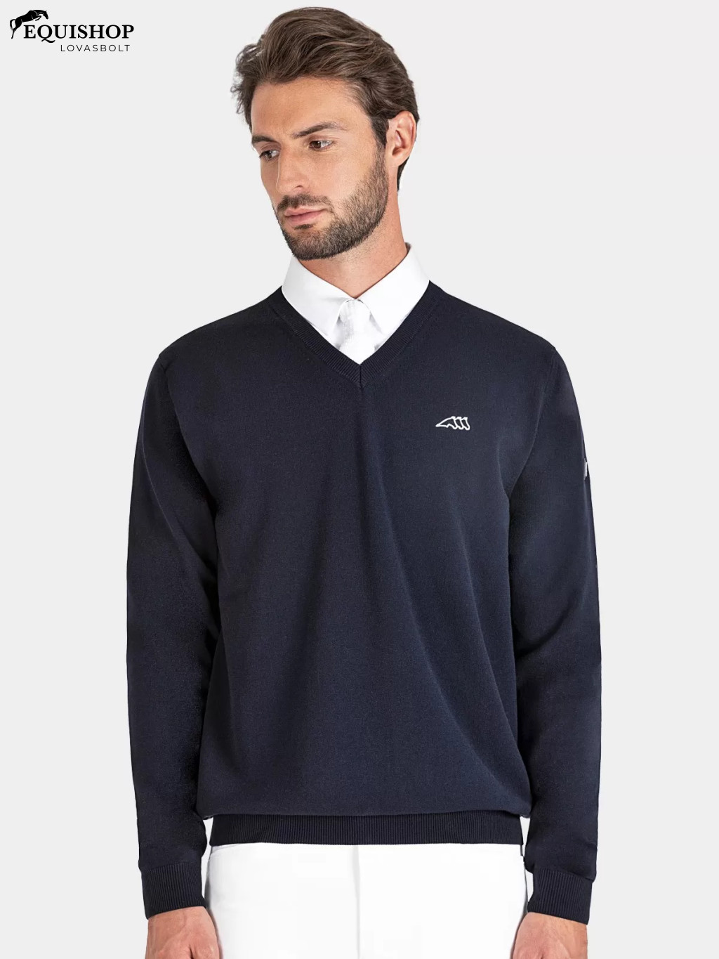 Kék színű, V-nyakú férfi pulóver, rendkívül légáteresztő és rugalmas anyagból, puha és meleg. Equiline hímzett körvonalas logóval a mellkason.
