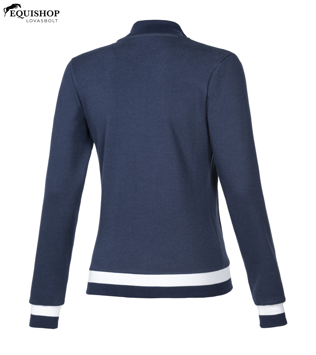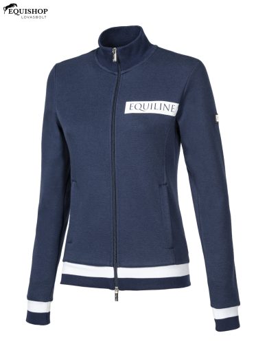 Női kardigán az Equiline nyári kollekciójából. Ez a kardigán kényelmes és légáteresztő anyagból készült. Az ujjak és az alj bordázott. A kardigán kétirányú cipzárral és két cipzáras zsebbel rendelkezik. A kardigán bal mellkasán sportos Equiline felirattal, a bal ujján pedig Equiline jelvénnyel díszített.