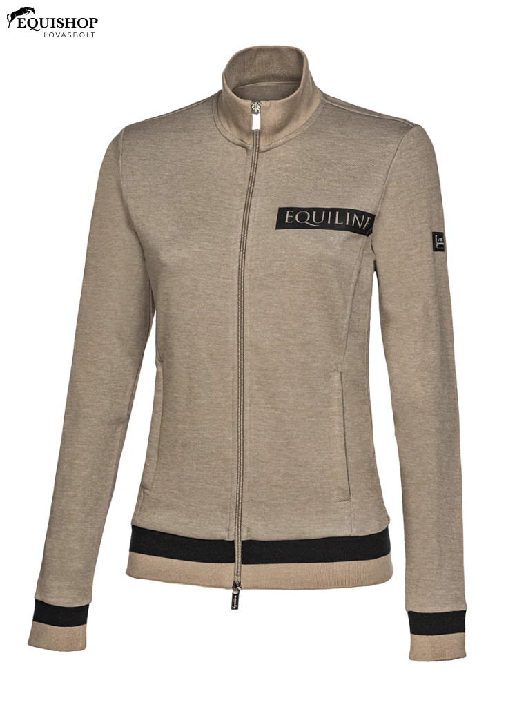 Női kardigán az Equiline nyári kollekciójából. Ez a kardigán kényelmes és légáteresztő anyagból készült. Az ujjak és az alj bordázott. A kardigán kétirányú cipzárral és két cipzáras zsebbel rendelkezik. A kardigán bal mellkasán sportos Equiline felirattal, a bal ujján pedig Equiline jelvénnyel díszített.