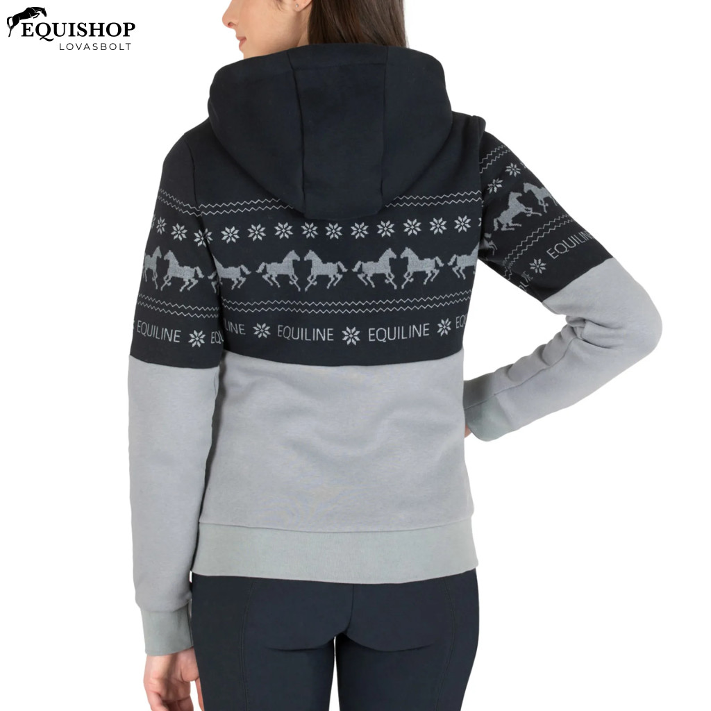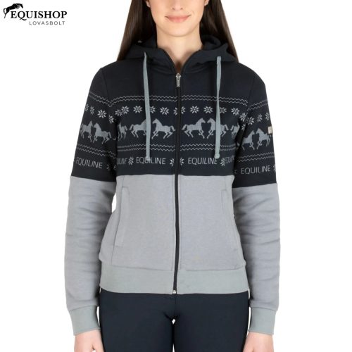 Az Equiline Nilvian kapucnis pulóver tökéletes téli hangulatot teremt. Ez a puha és kényelmes kabát teljes cipzárral és két cipzáras zsebbel tökéletes téli edzéshez vagy szabadidőhöz. A kontrasztos szürke hópelyhek, lovak és a nyomtatott Equiline logó skandináv dizájnt alkotnak egy csipetnyi lovas stílussal.