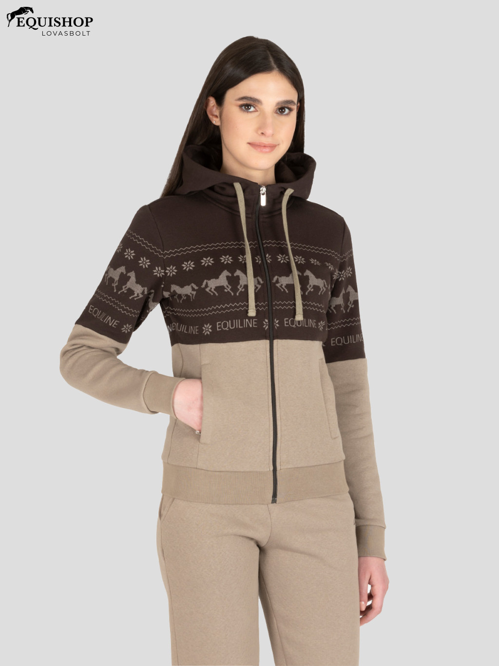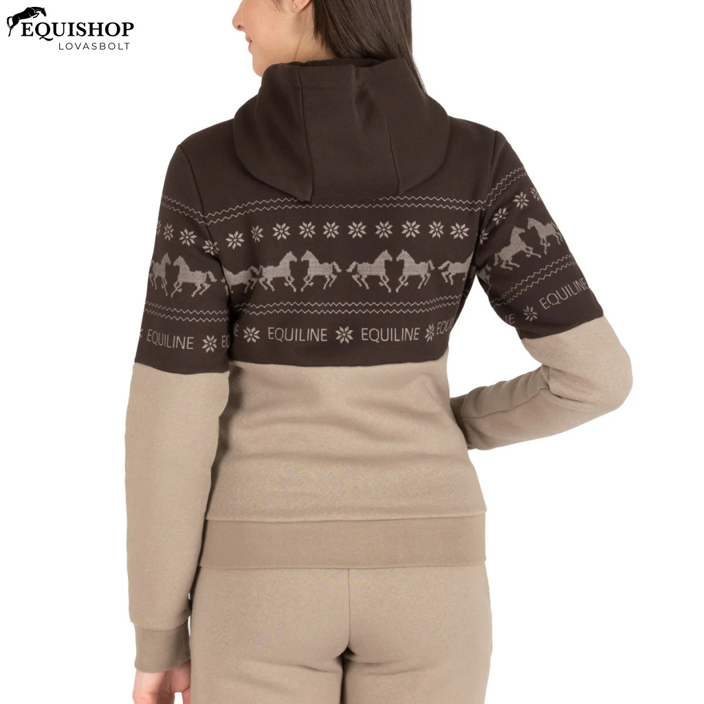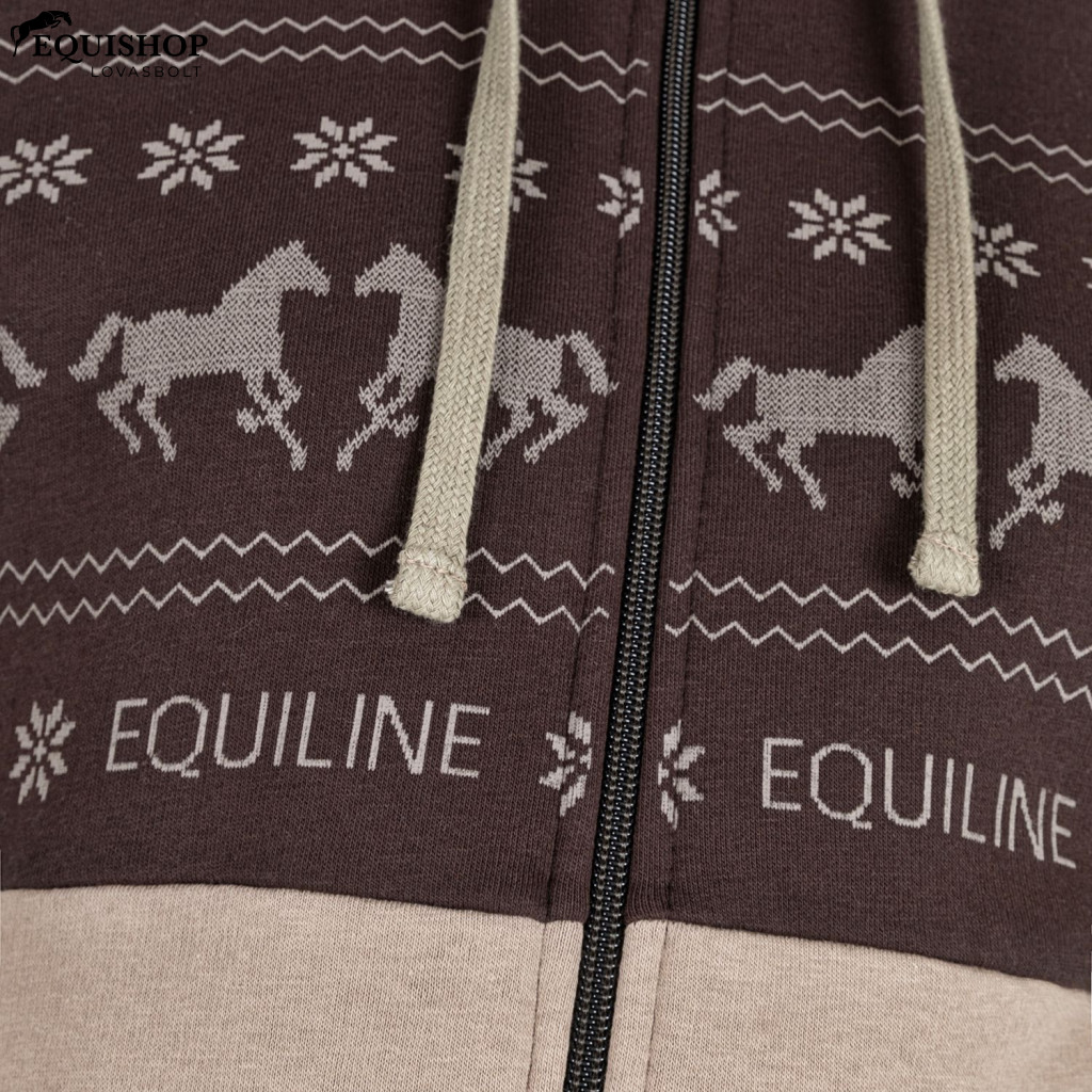 Az Equiline Nilvian kapucnis pulóver tökéletes téli hangulatot teremt. Ez a puha és kényelmes kabát teljes cipzárral és két cipzáras zsebbel tökéletes téli edzéshez vagy szabadidőhöz. A kontrasztos szürke hópelyhek, lovak és a nyomtatott Equiline logó skandináv dizájnt alkotnak egy csipetnyi lovas stílussal.