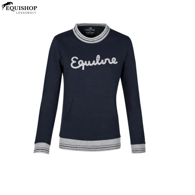 Női Equiline Pacific pulóver kerek nyakkivágással. Jersey kötött anyagból készült, amely puha tapintásáról és tökéletesen esendő. Légáteresztő, nagy elülső zsebbel. A pulóvert az egyik vállán egy kis jelvény, valamint egy nagyméretű, kristályokkal díszített Equiline felirat díszíti.