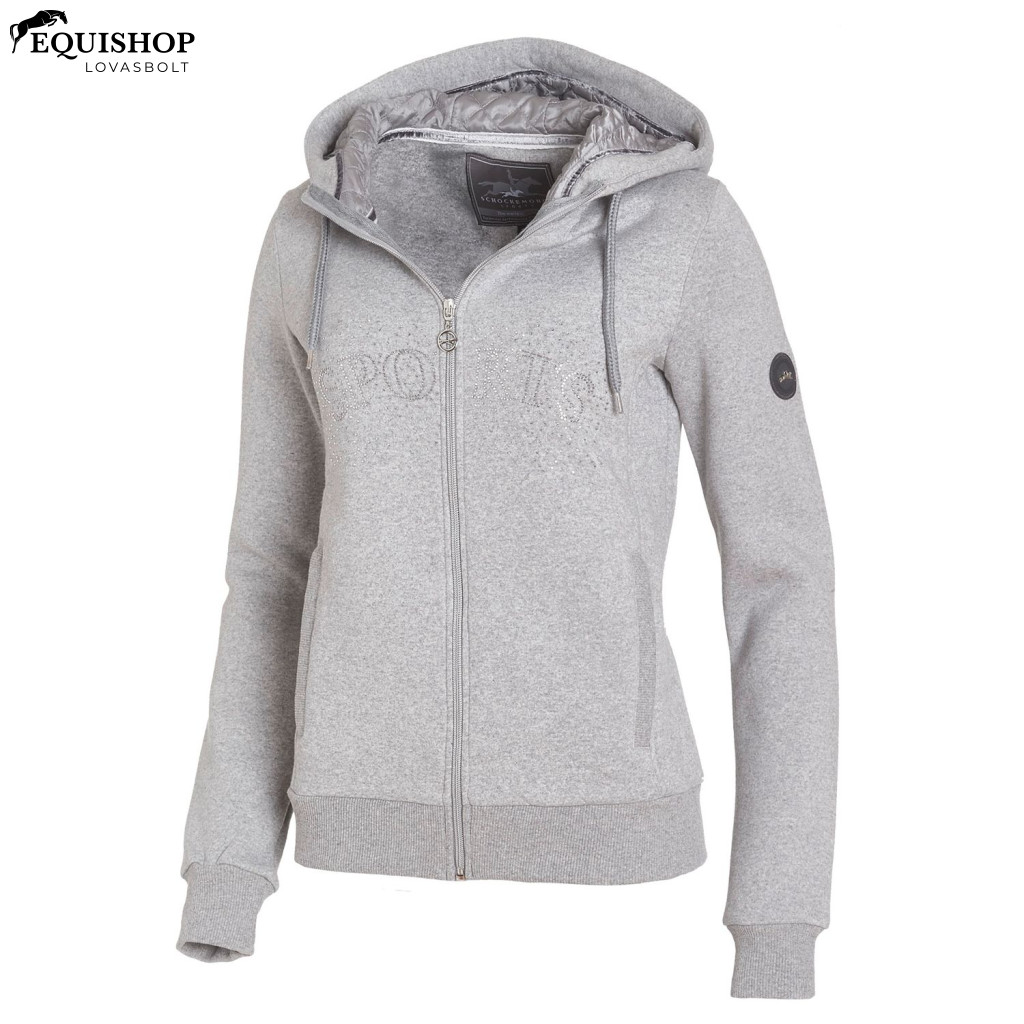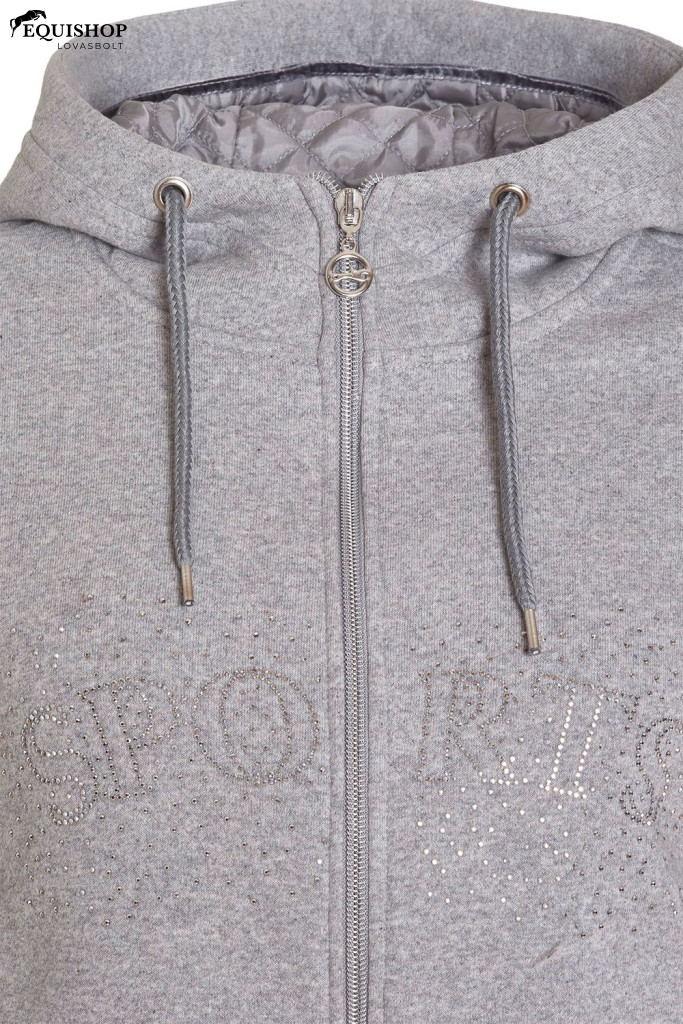 Olyan kényelmes, hogy le sem akarod majd venni: a Schockemöhle Sports Cassie.SP Style melegítőpulóvere! A nagy, cipzáras, paszpartus zsebek helyet biztosítanak a mobiltelefonodnak és egyéb holmidnak – vagy akár a fázós kezeidnek. Amikor a szél süvít a füledben, a steppelt nejlonnal bélelt kapucni melegen tart. Az elülső részen található strassz motívum sportos és stílusos megjelenést kölcsönöz a pulóvernek.