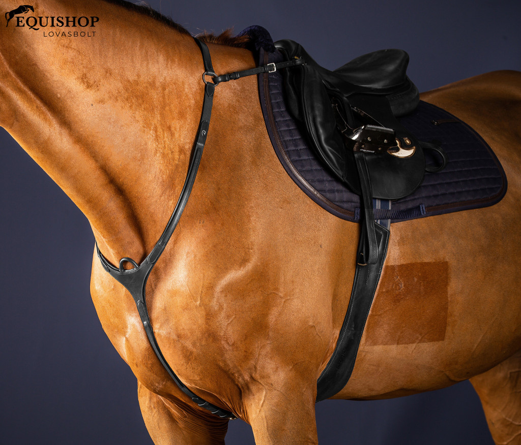 Ami ezt a szügyelőt igazán különlegessé teszi, az az átgondolt ergonomikus kialakítás. A „bridge” rész stabilizálja az illeszkedést, megakadályozza a nyomás felhalmozódását a vállakon, és biztosítja, hogy a felszerelés rendezett módon a helyén maradjon. Ez a megoldás különösen előnyös lejtős vállú vagy keskenyebb felépítésű lovak esetében, ahol a hagyományos kialakítások könnyen lecsúszhatnak.