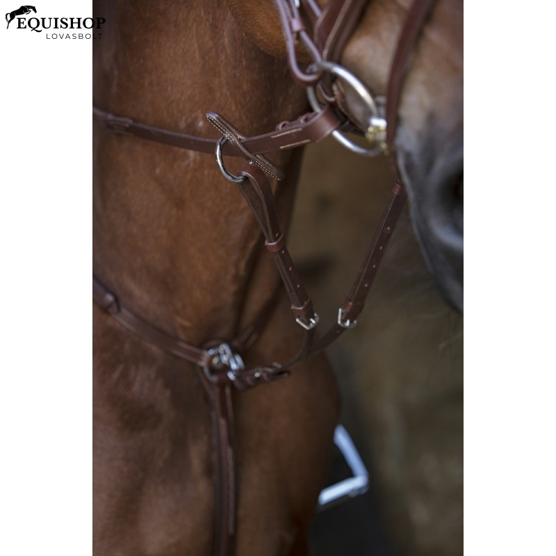Szügyelő martingállal, dekoratív varrással. Rozsdamentes acél csatok.