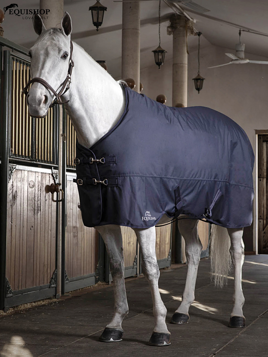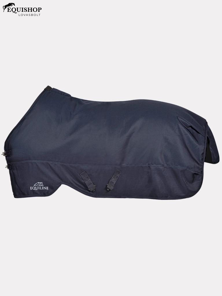 Kék istállótakaró, külsőleg 1200 denier szakadásálló poliészterből készült. Belső bélés antiallergén és antibakteriális svájci pamut és poliészter szövettel. 400 g-os légáteresztő vatelinnel bélelve. Állítható elülső záródás a tökéletes illeszkedés érdekében minden lóra. Fehér Equiline logóval az elején.