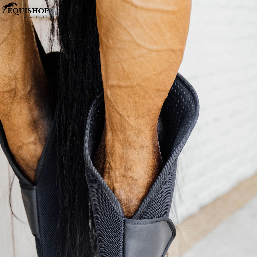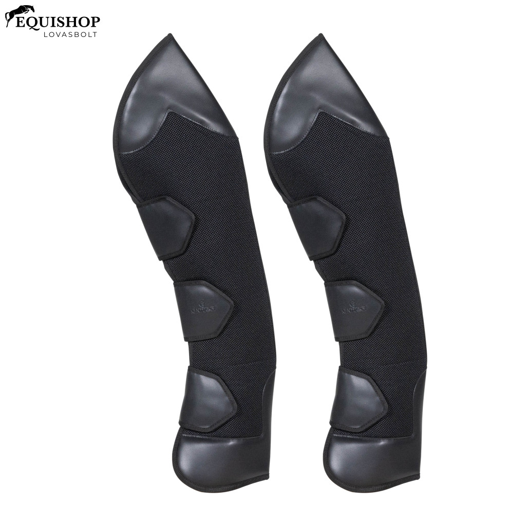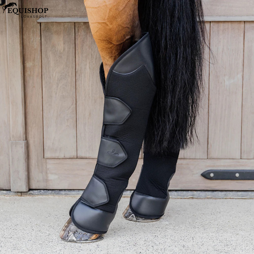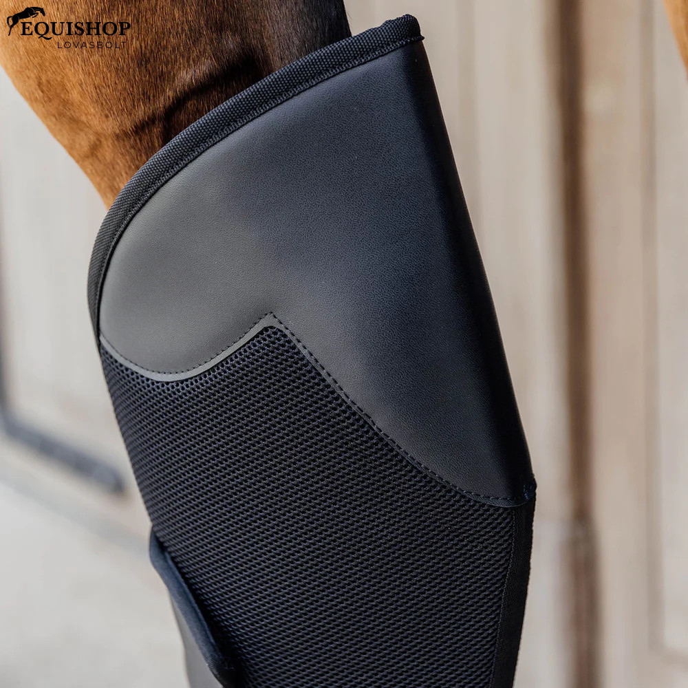 Ezek az erős és kényelmes 3D Spacer utazólábvédők védik a csüdöt, a csüdöt, az inakat és a csánkot. A tartós anyagoknak köszönhetően a csizmák minden utazás során megvédik lovát. A kiválóan lélegző anyag megakadályozza, hogy lova lábai túlmelegedjenek szállítás közben. A csüd területe Kentucky műbőrrel van megerősítve. Ezért az érzékeny sarokrész extra védett. A hátsó csizmák hosszabbak, hogy megvédjék lova csánkját.